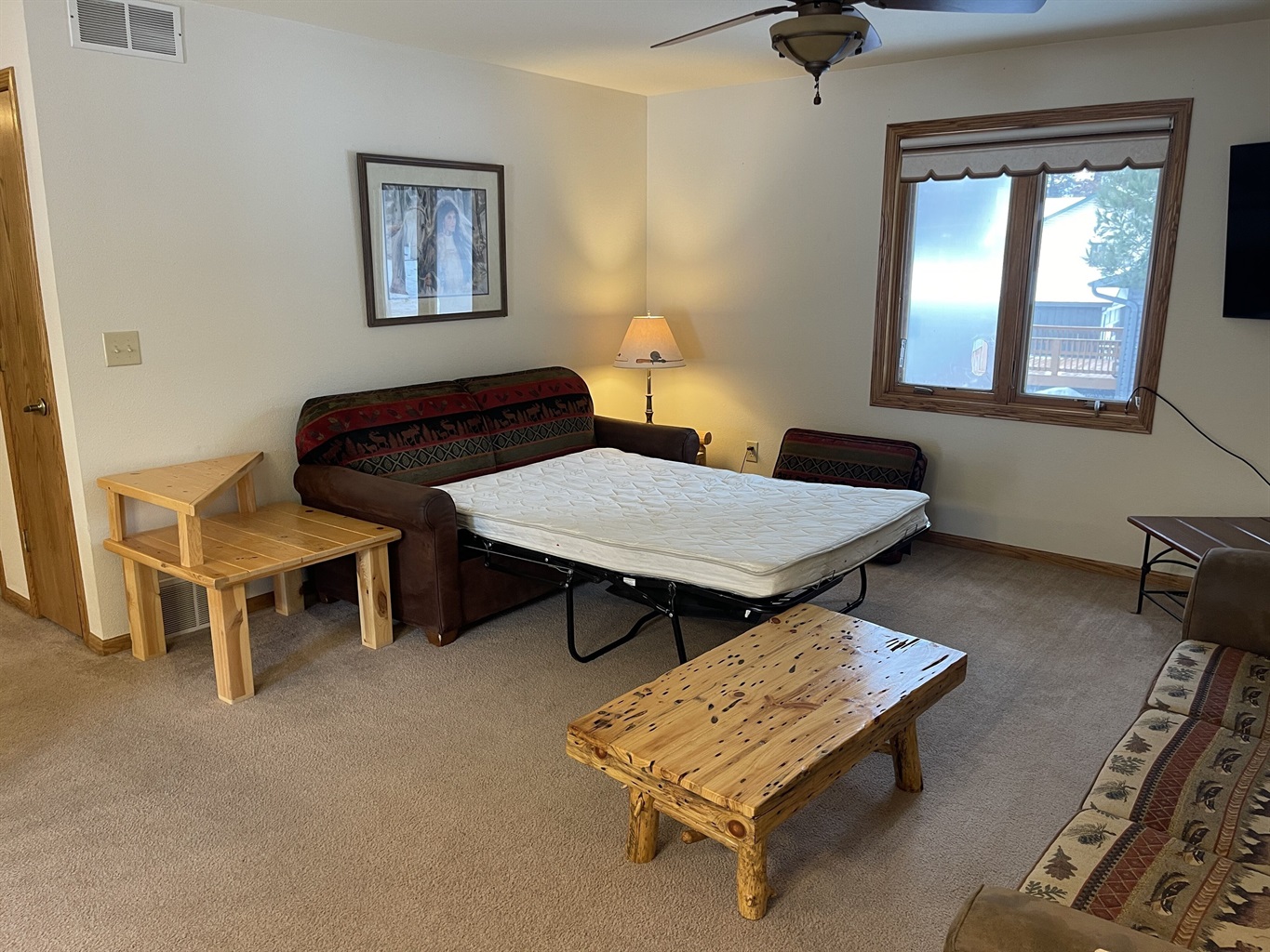 As you step inside, you'll be greeted by a warm and inviting atmosphere that reflects the beauty of the surrounding nature.- Spacious Living Area: Designed for comfort, featuring a pull-out couch that easily transforms into an additional sleeping option.